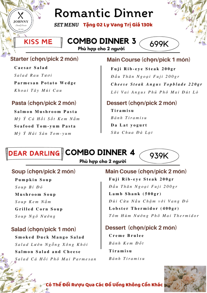 Combo Dinner Hẹn Hò Tặng Kèm Vang Đỏ